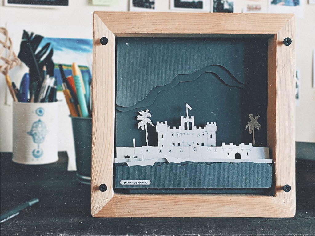 Paper cutout of the Fort Qaitbay in Alexandria. Handmade paper model (dark blue and gray), wooden frame of 20*20cm, plexiglass shield.