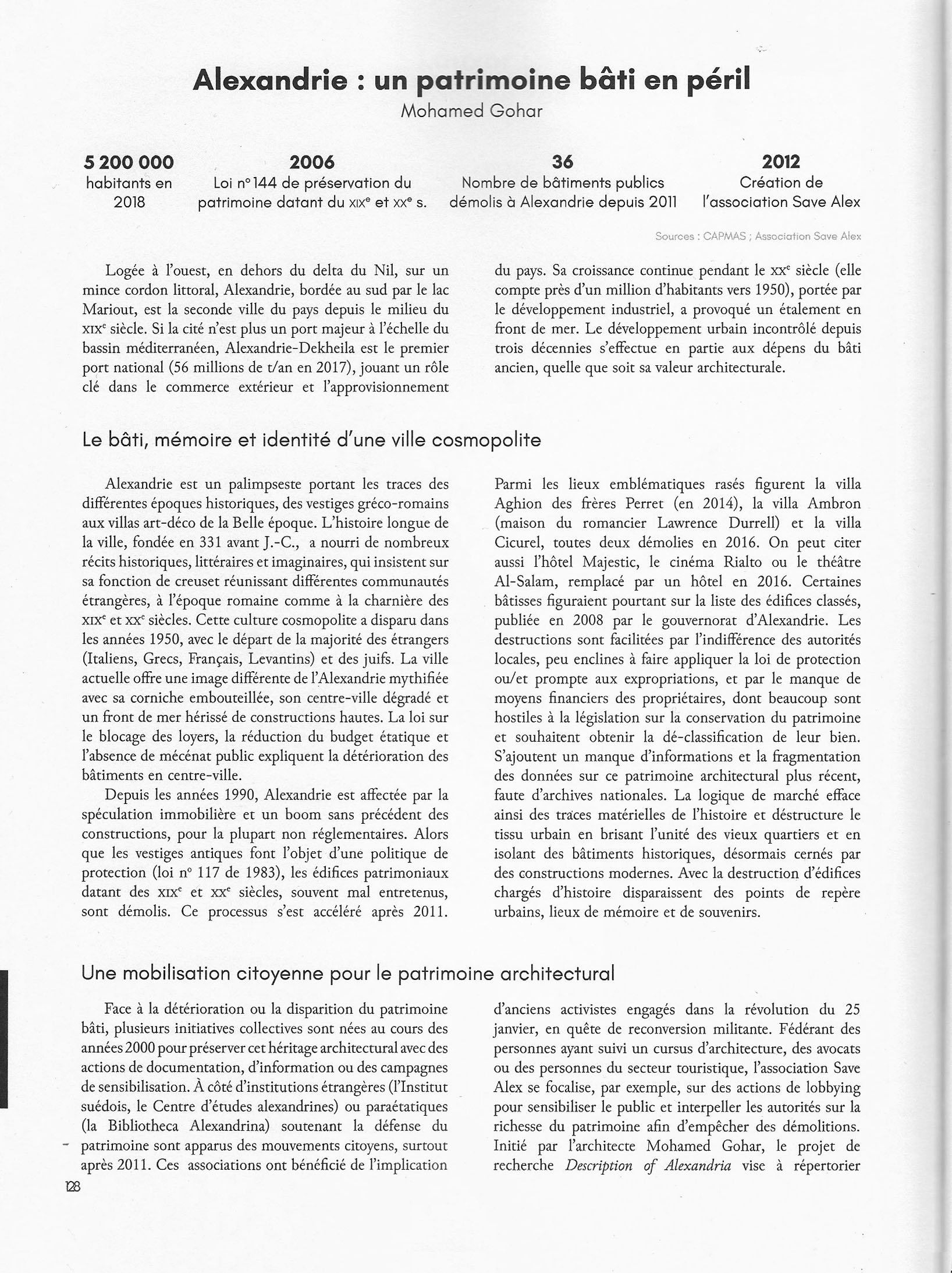 Alexandrie : un patrimoine bâti en péril. I am very happy to write about Alexandria and to contribute to the Atlas of contemporary Egypt published in 2020 by CNRS Édition, Paris (the French national center for scientific research) supported by CEDEJ – Egypte in Cairo.
