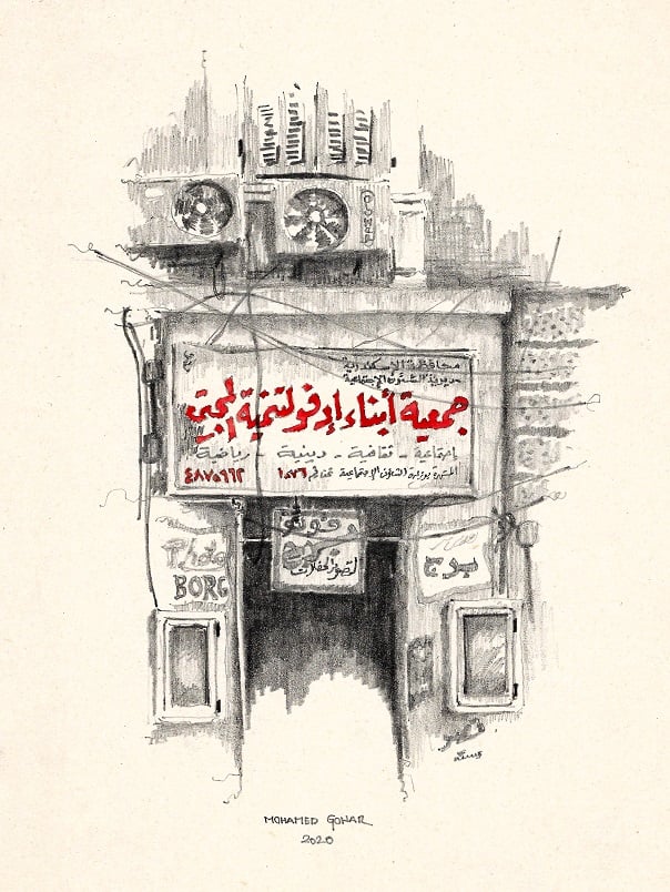 The first association started operating in Egypt in 1821 under the name: The Greek association in Alexandria. Through history, society associations passed by several phases, changes and amendments. Due to domestic and/or foreign immigration, associations that serve specific communities used to be founded in big cities, where there are several communities and groups of people living together. In this drawing the Arabic text reads: Association of Edfo (a city in Aswan) people for society development. This association was founded in 2003, building number 44, Al Nabi Daniel street.