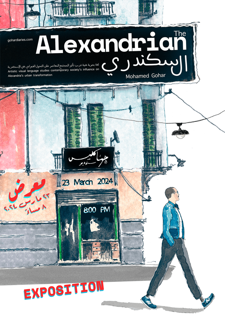 In my Artwork and Urban Research, I employ artistic visual language to explore the dynamics of present-day Alexandria society and its impact on the city’s urban and Built Environment evolution. My goal is to observe and analyze the communal behaviors of the city’s inhabitants, with a focus on fostering an impartial understanding of shifting values and cultures. Through this endeavor, I strive to facilitate communication and knowledge-sharing among diverse groups of individuals engaged in contemporary Alexandria.