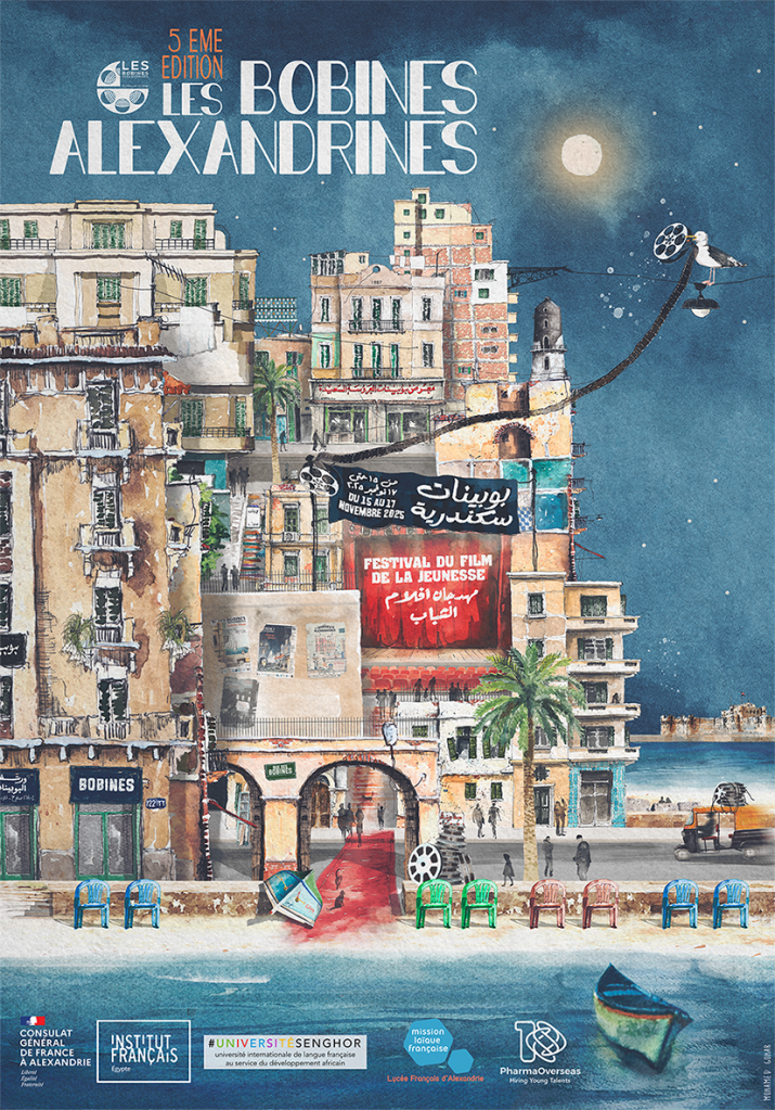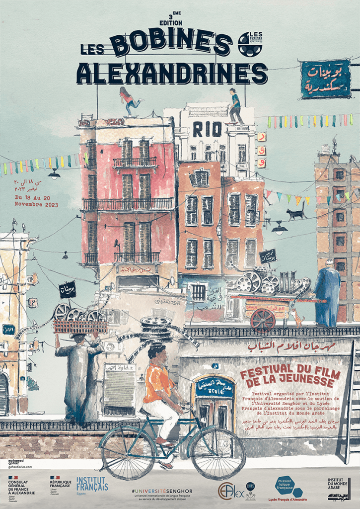 – It was a pleasure to be invited to illustrate and design the poster and animation of the 3rd edition of the cinema festival: Les Bobines Alexandrines by the Institut Français d’Alexandrie, Senghor University, Lycée Français d’Alexandrie and the Institut du Monde Arabe.