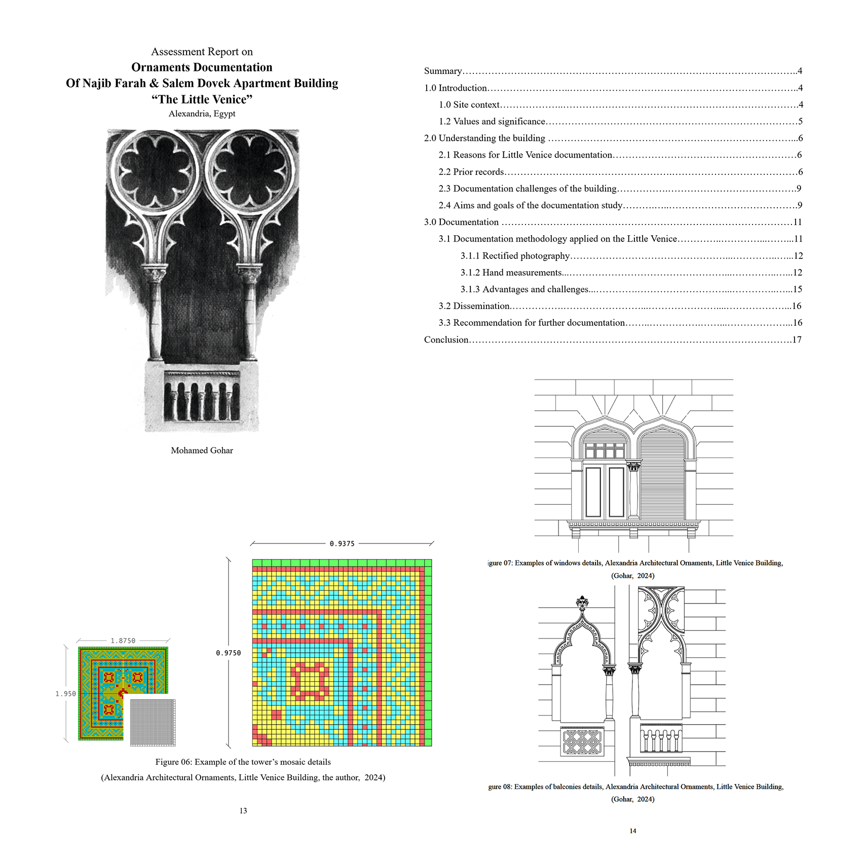 I am honoured that my work, “Alexandria Architectural Details: Little Venice Building”, has been published by the Bibliotheca Alexandrina – مكتبة الإسكندرية, Alexandria and Mediterranean Research Center (Alex-Med). This documentation work was commissioned in 2022 by the Alexandria and Mediterranean Research Centre of Bibliotheca Alexandrina (Alex-Med) to document all exterior ornaments of the Najib Farah & Salem Dovek registered heritage apartment building located on the Corniche of Alexandria, Egypt. The aim was to survey and document all motifs and ornaments that adorn the four facades of the building. The project involved field inspections, a photographic inventory of the character-defining architectural elements on the facades, and the production of detailed and scaled two-dimensional AutoCAD drawings. The publication includes 30 plates featuring manual artwork and representing a selection of the documented ornaments. The documentation techniques employed combined image-based methods and traditional terrestrial surveying, including rectified photography and hand measurements.